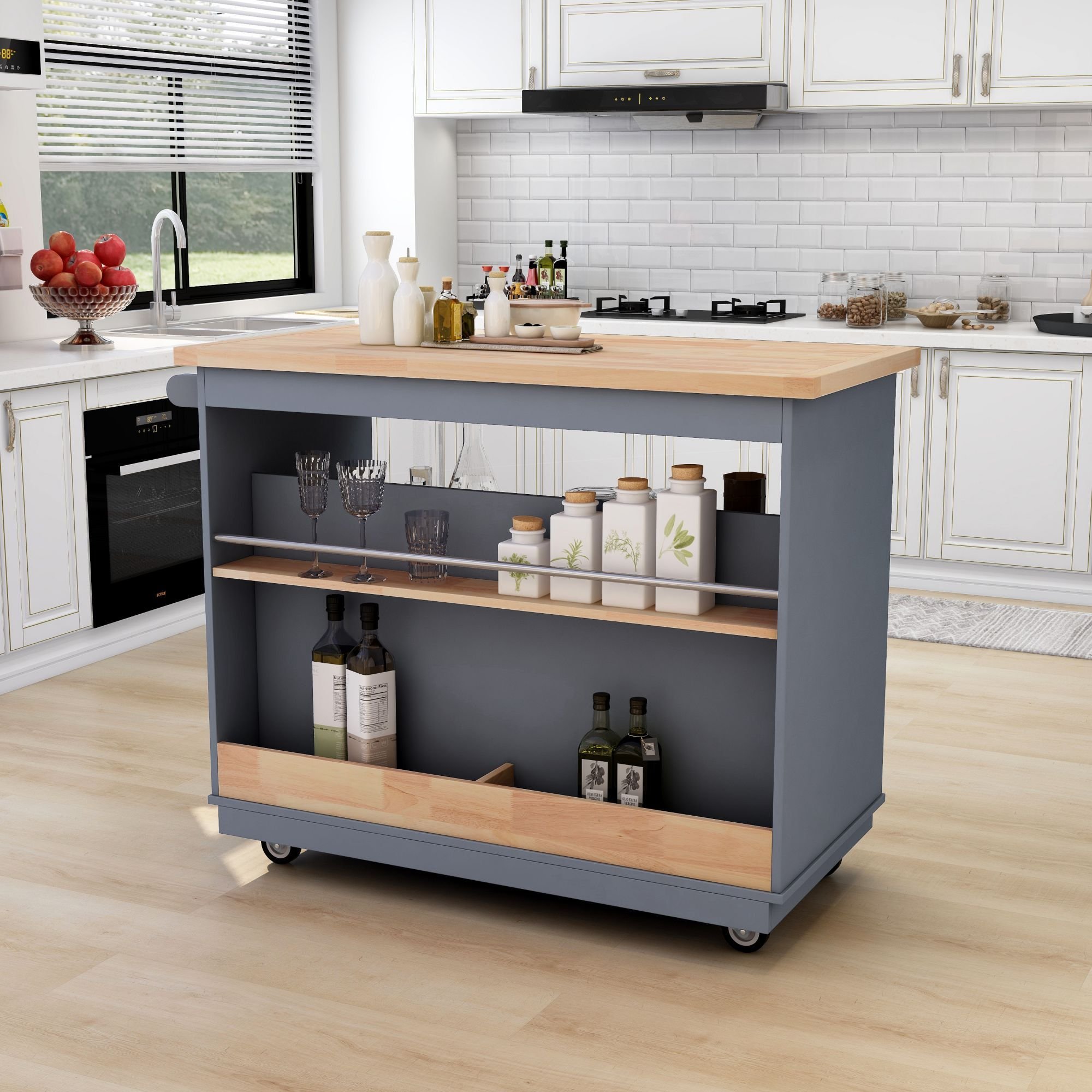 [Mobile Kitchen Island] Our kitchen island is equipped with 4 x 360-degree wheels including four lockable wheels, ensuring optimal convenience and stability. These specially designed wheels allow for effortless movement within your kitchen, eliminating any hassle or strain. Once you have found the perfect spot for your island, it will remain securely in place.